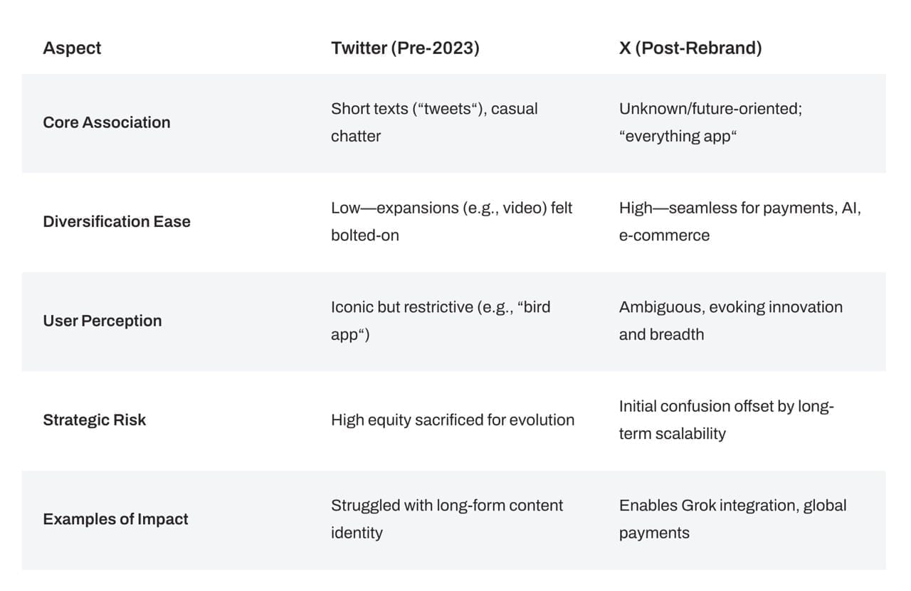 Now, while Twitter’s branding built iconic recognition over 17 years, it also, in many ways, constrained the platform's perceived identity to text-based social chatter. Below, I’ll break down how X’s open-ended branding facilitates diversification, drawing on strategic, perceptual, and practical dimensions.